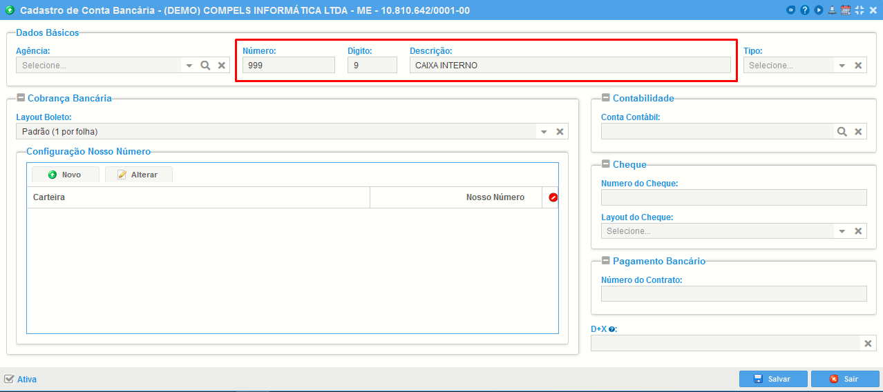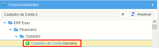 Acesse a tela de "Cadastro de Conta Bancária" conforme mostrado abaixo: