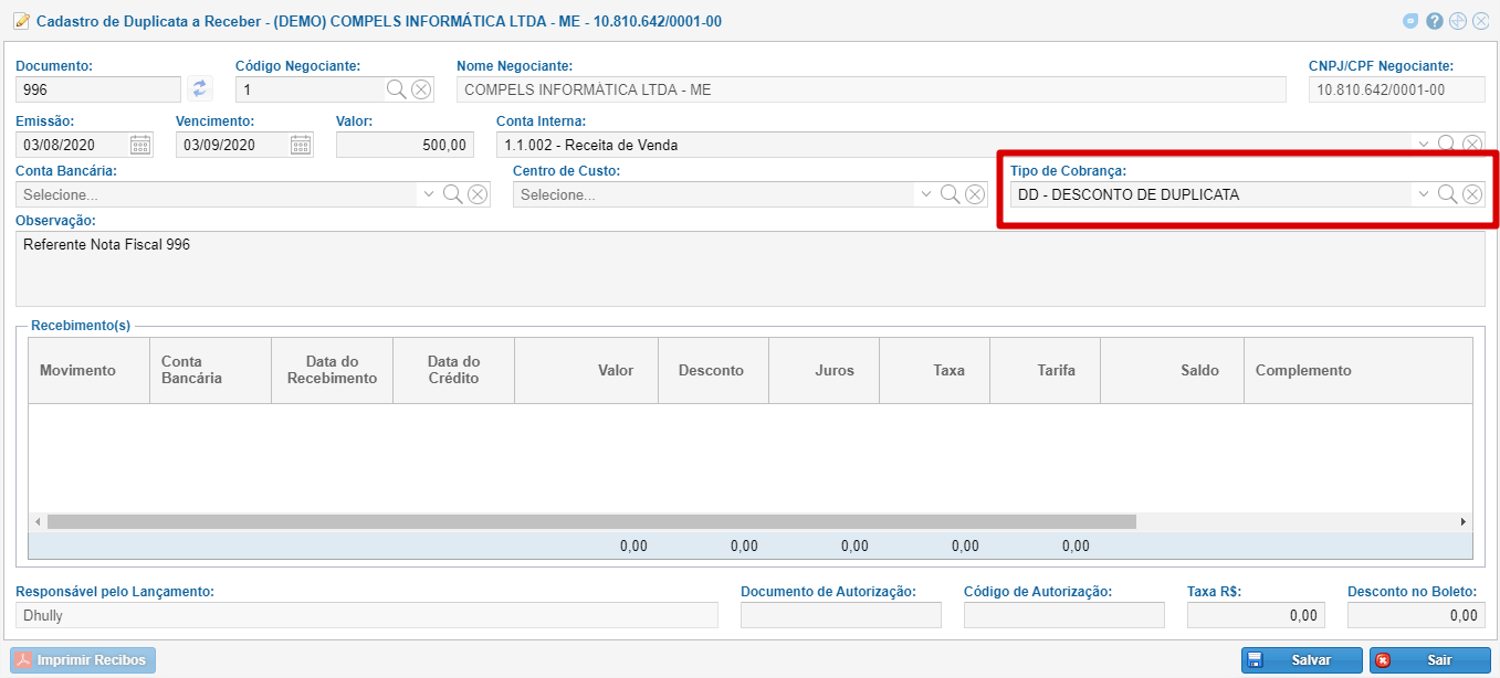 Esta duplicata será descontada, então para isso, marque-a como desconto de duplicatas utilizando um Tipo de Cobrança que corresponda à operação,para que ela possa ser gerenciada, uma vez que se o cliente não pagar o responsável pelo pagamento é a empresa.
