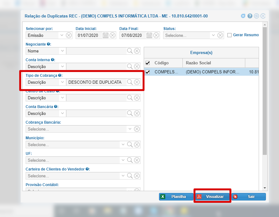 Após esta marcação é possível saber através dos relatórios de Tipo de Cobrança quais são as duplicatas que foram descontadas e quais não foram.
