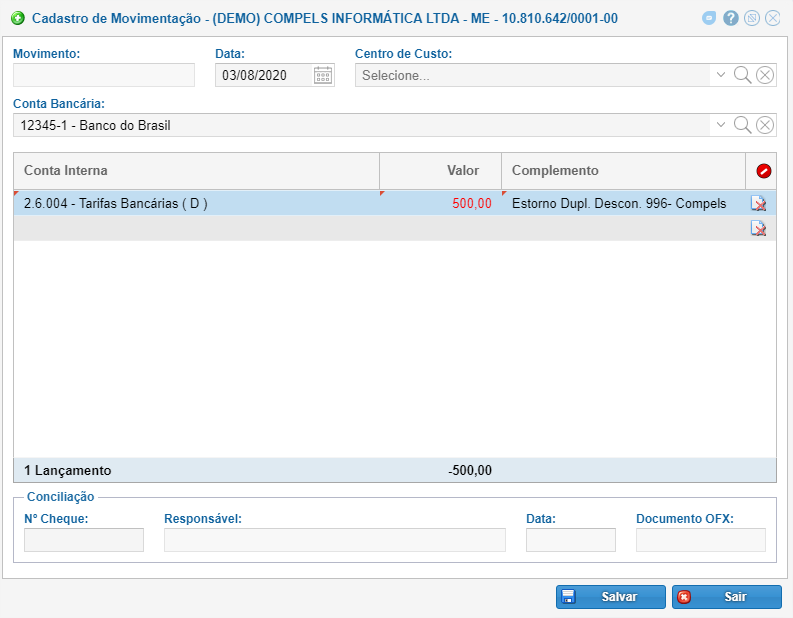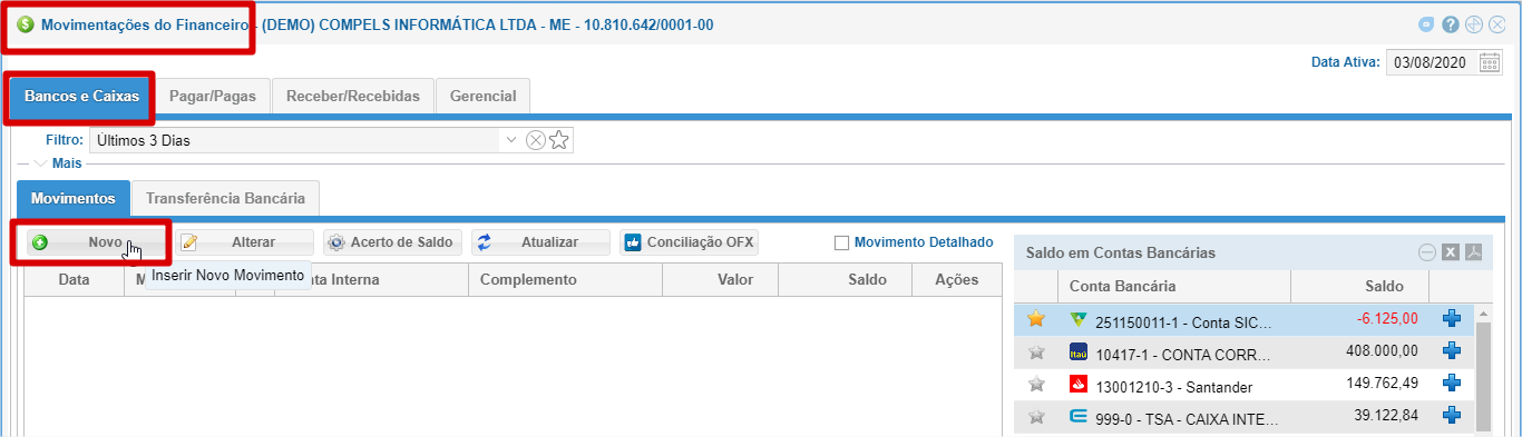Para isso acesse a tela de Bancos e Caixas, e faça os seguintes lançamentos: