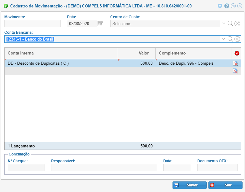 Em seguida precisamos fazer a entrada de dinheiro no caixa da empresa, e o respectivo desconto das taxas da operação de desconto.