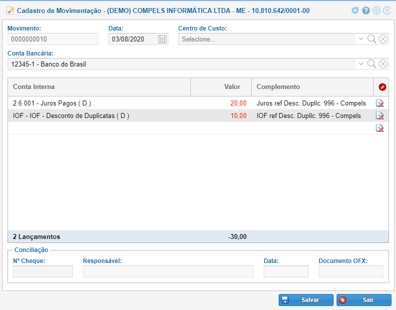 Lançamento 2 (saída de dinheiro do caixa, referente à Juros e IOF).