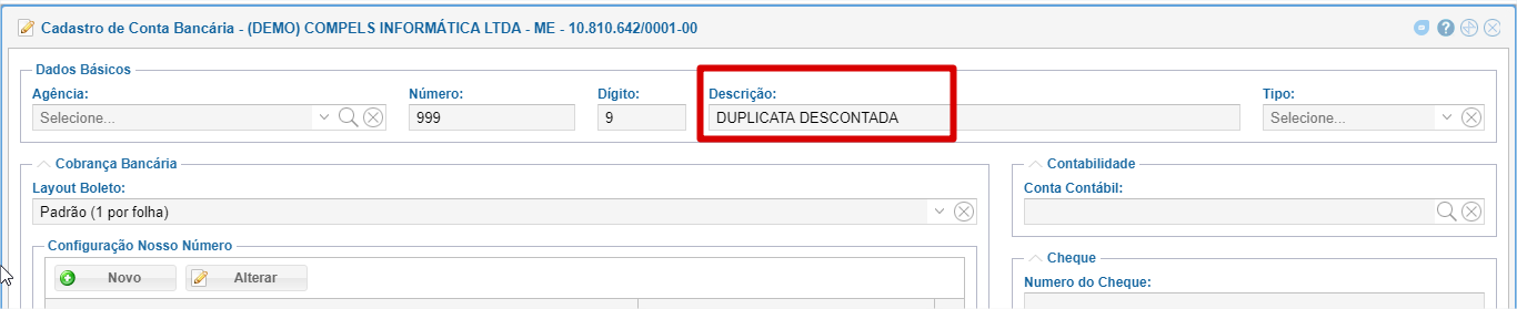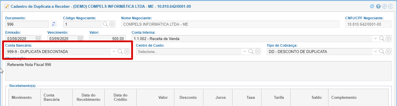 Para isso cria-se uma conta bancária para registrar o desconto de duplicatas, em seguida é informado na duplicata que ela será baixada na conta bancária para controle das duplicatas descontadas.