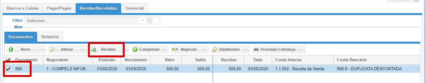 A partir deste ponto, faça a baixa desta duplicata normalmente utilizando a função de recebimento.