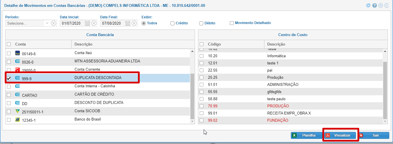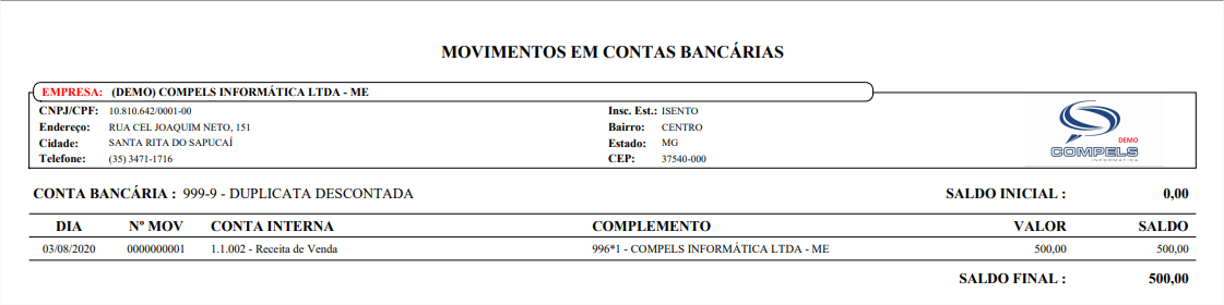 Acesse o relatório de Detalhe de Movimentos em Contas Bancárias e informe a conta de duplicatas descontadas.