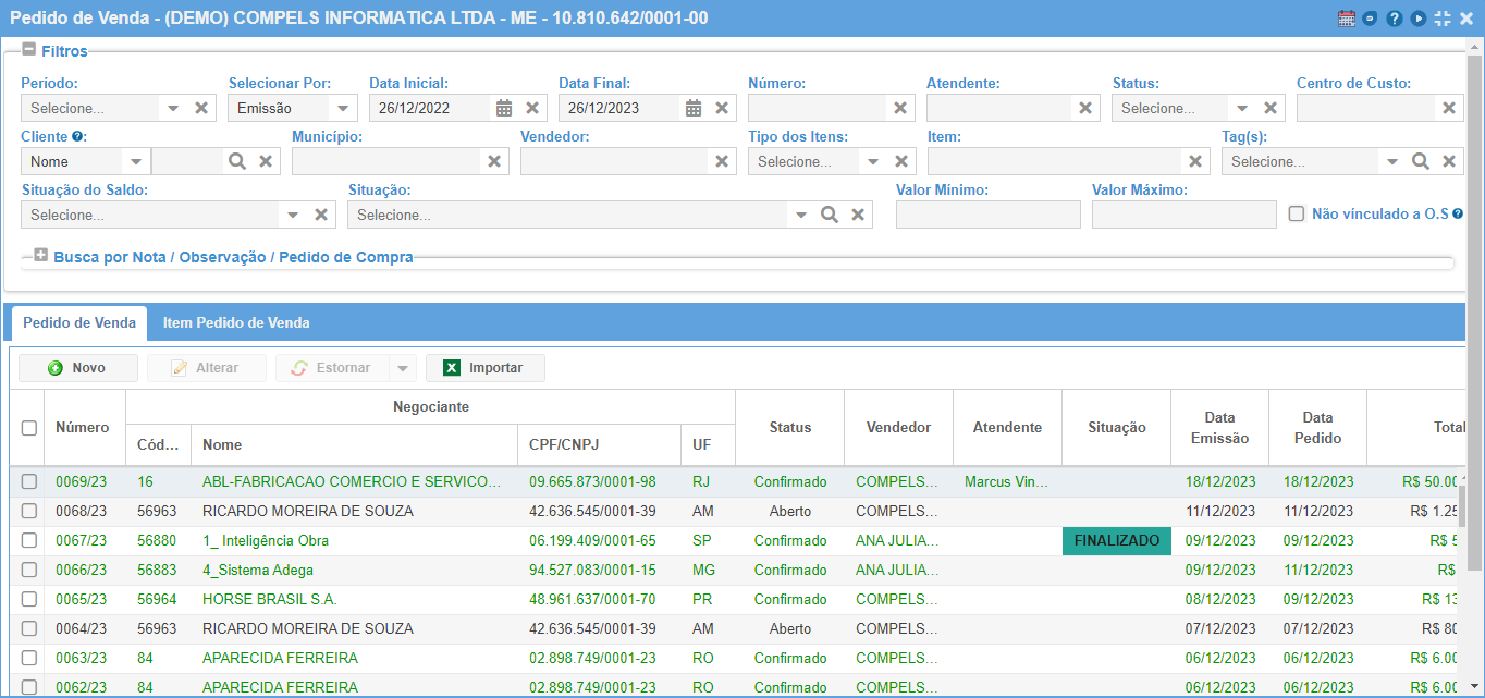 Assim que acessar a tela, é mostrado uma listagem com todos os pedidos de vendas cadastrados, onde nesta listagem também é possível cadastrar ou alterar através dos botões "NOVO" ou "ALTERAR".