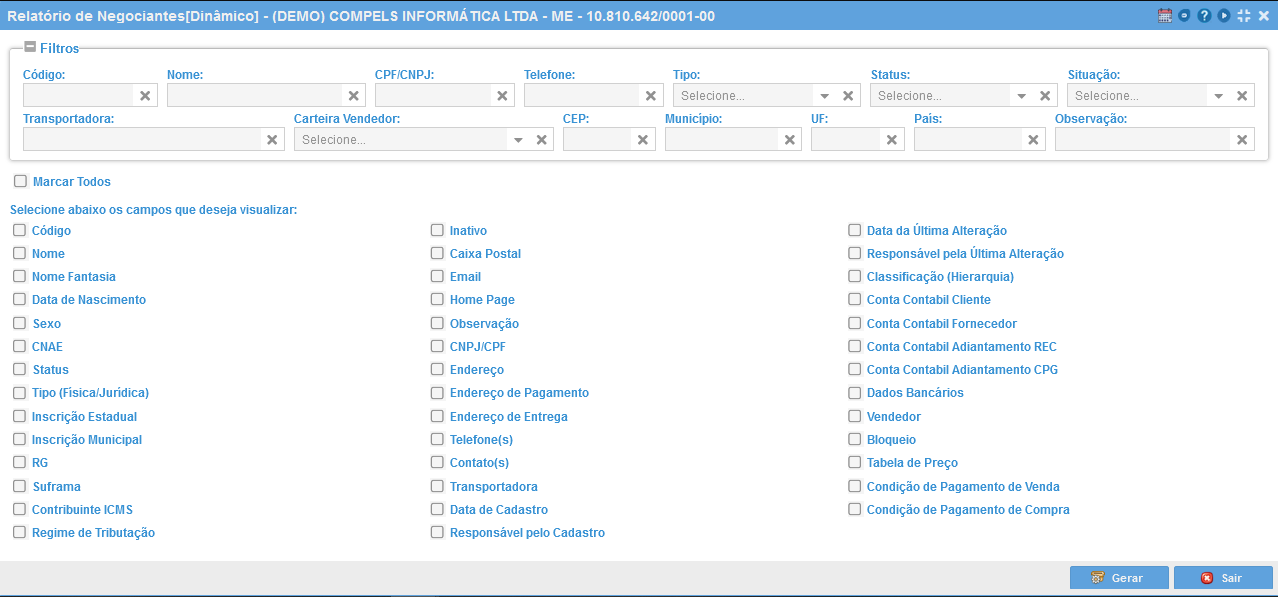 A tela abaixo será apresentada. Selecione quais campos você deseja visualizar em sem seguida clique no botão "Gerar".