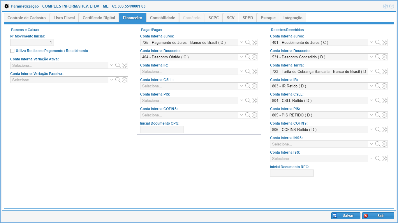 Nesta aba configuramos as principais operações que são realizadas pelo módulo financeiro.