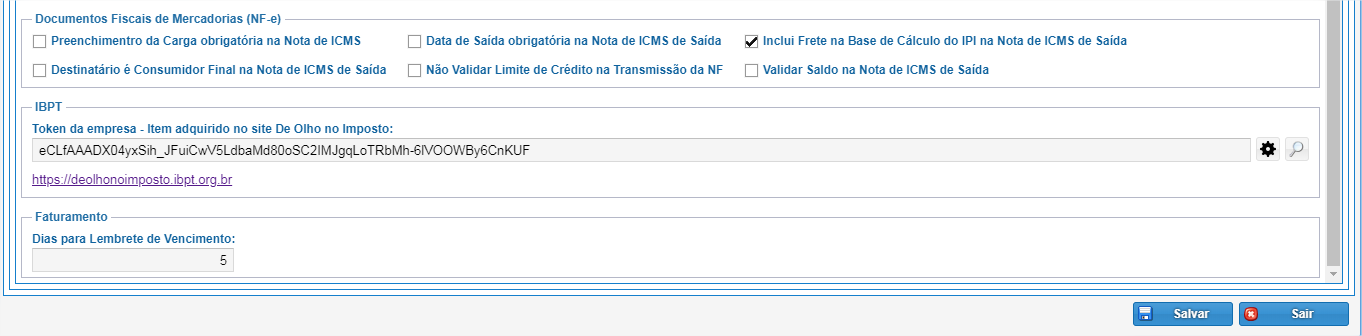 Faturamento: Informar o número de dias para Lembrete de Vencimento.