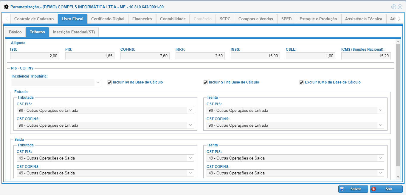 CST PIS/COFINS: este campo deve ser configurado tanto para a entrada quanto para a saída de notas fiscais na opção tributada e isenta, dentre as opções disponibilizadas pelo FISCO.