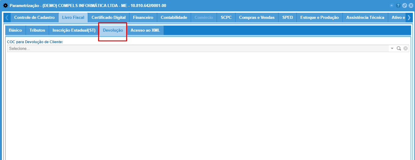 Nessa aba pode ser definido qual o COC de devolução será utilizado na entrada de uma nota de devolução de um Cliente.