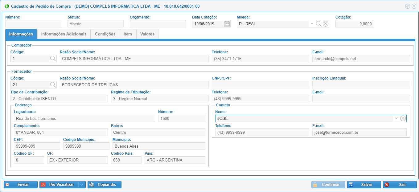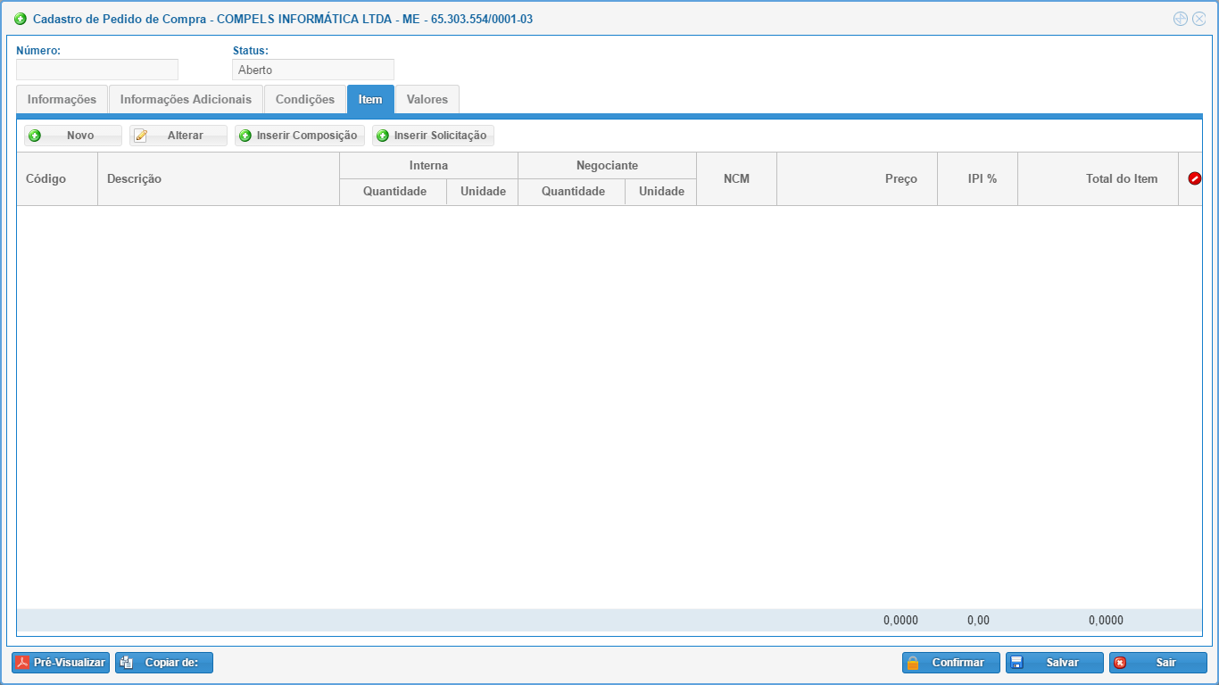 Nesta tela serão inseridas todas as informações para que se possa gerar o Pedido de Compra que poderá ser importado para a Nota Fiscal.