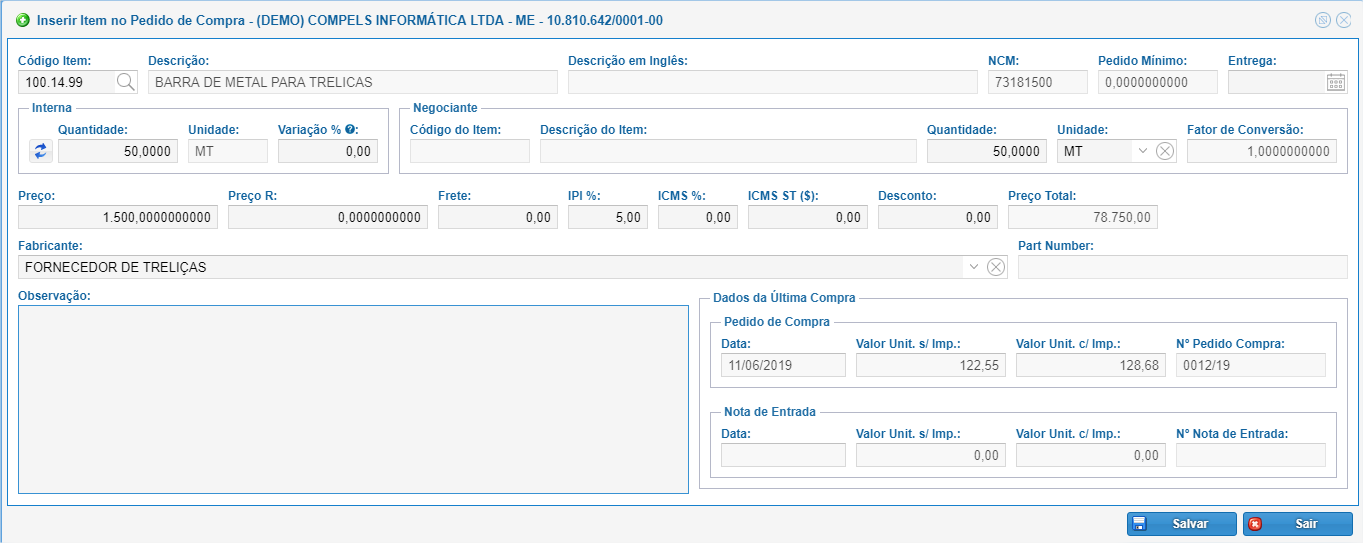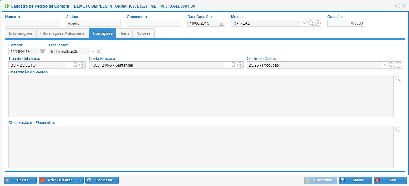 Observação do Pedido: informação que será utilizada somente no pedido de compra.
