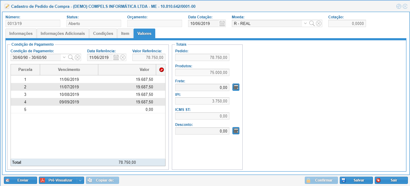 Moeda: informar a moeda que será utilizada na negociação desse pedido de compra.
