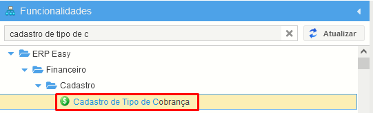 Acesse a tela de "Cadastro de Tipo de Cobrança" conforme mostrado abaixo: