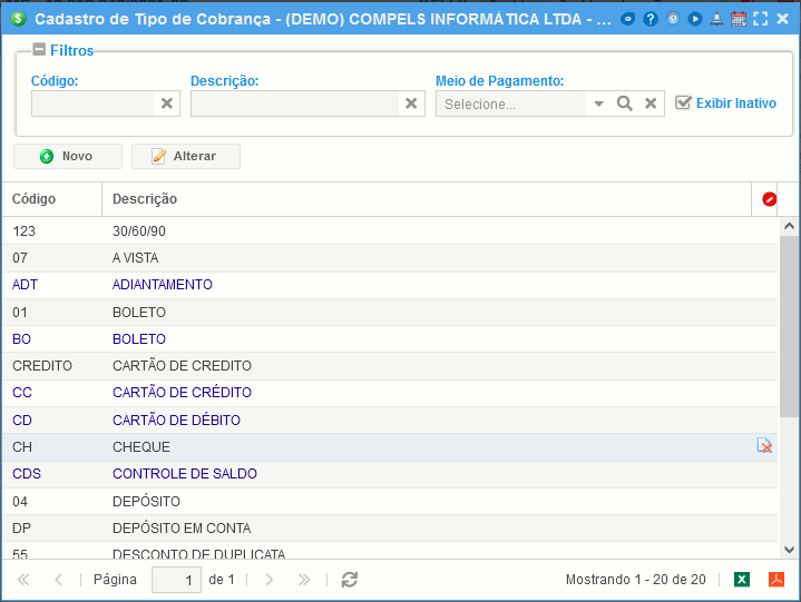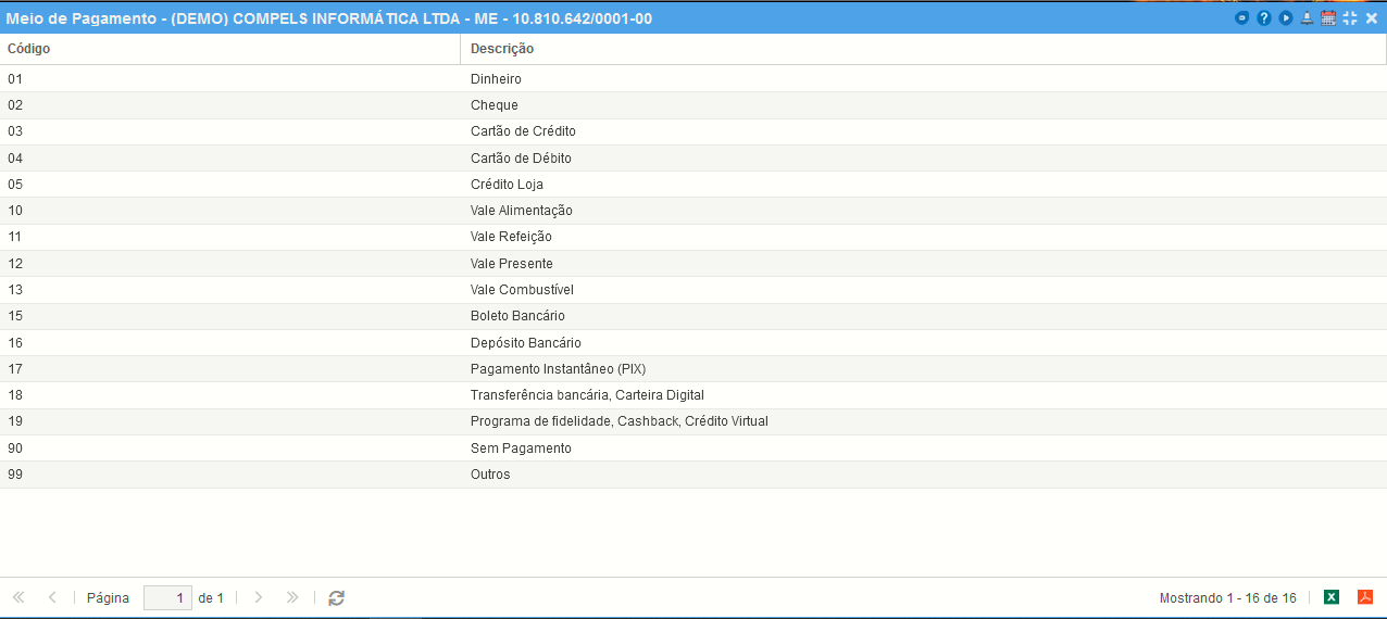 Os Meios de Pagamentos são cadastros padrões do sistema, não sendo possível incluir, alterar ou excluir.