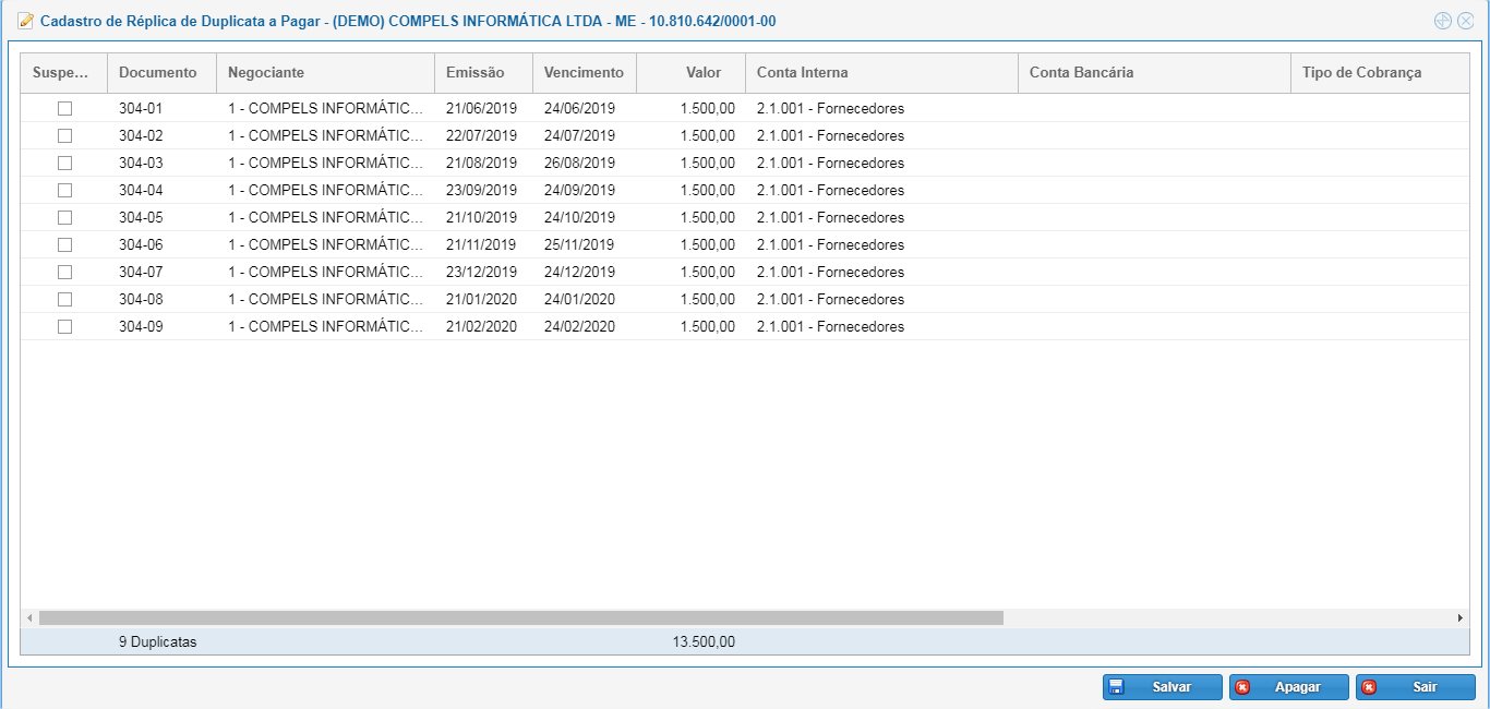 Ao alterar o valor de uma duplicata, o sistema pergunta se deseja alterar o valor das seguintes. Se sim, todos os valores das réplicas são atualizados de uma só vez.
