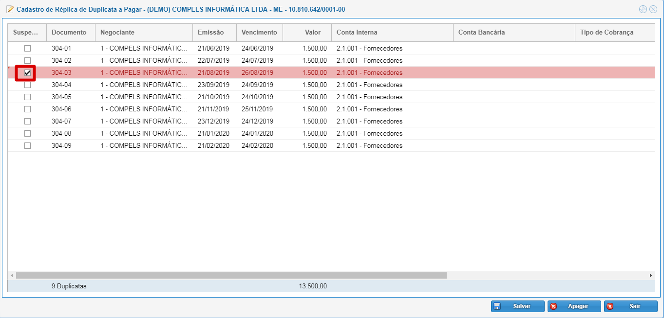 Caso apenas uma duplicata deva ser excluída, deve-se usar a opção "Suspensa", mostrado na primeira coluna da tabela, se esta opção for marcada e a réplica for salva, esta duplicata não irá mais constar nas listagens do sistema, a menos que o usuários marque as opções para exibir também as duplicatas suspensas.