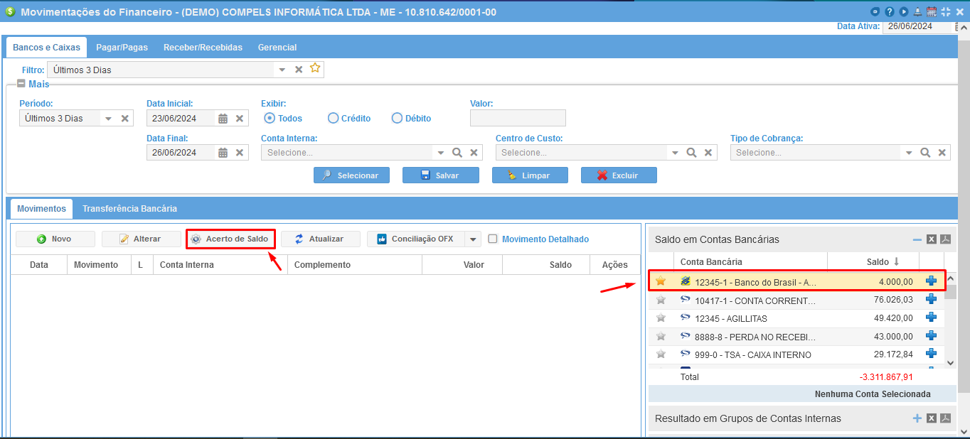 Na primeira aba na tela de movimentações financeiras, selecione o banco que deseja realizar este acerto e clique na opção "Acerto de Saldo" conforme mostrado abaixo.