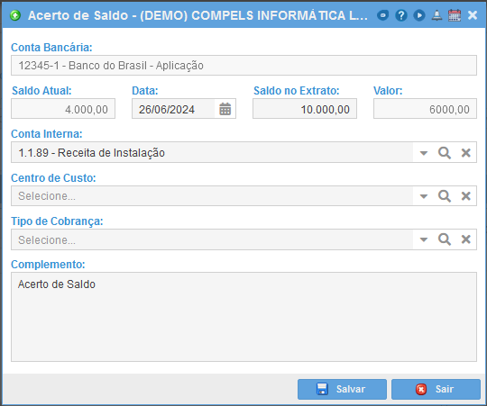 Para cadastrar um acerto de Saldo, informe os seguintes campos: