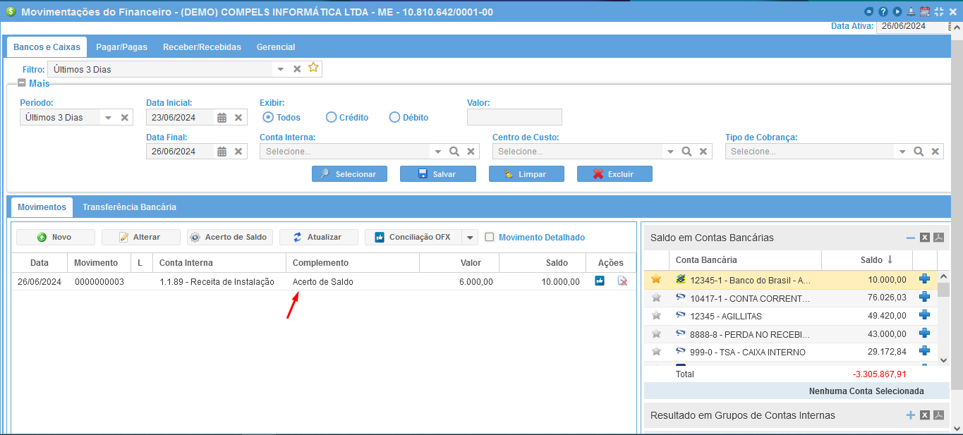 Realizado o acerto, será possível visualizá-lo nos movimentos.