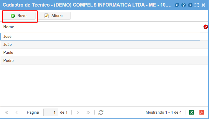 Para cadastrar um Técnico bastar clicar em "NOVO". Os demais técnicos já cadastrados aparecerão na lista abaixo.