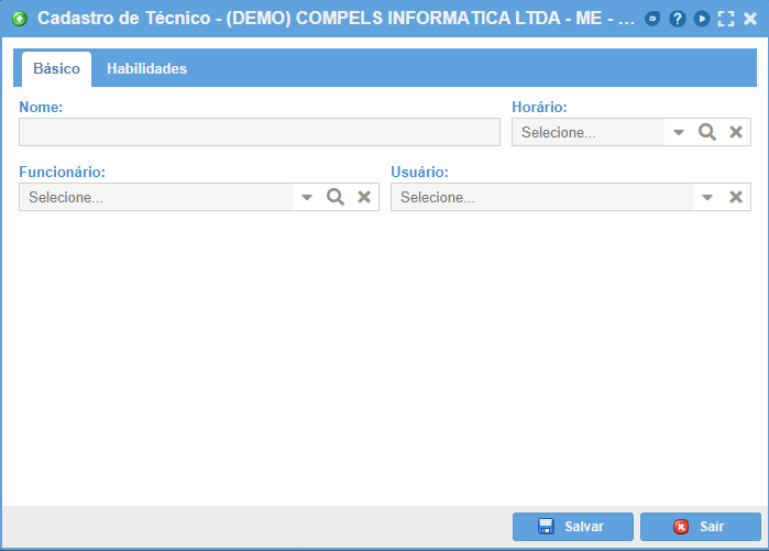Na tela do cadastro, na aba Básico basta preencher o nome do técnico e salvar. Também é possível vincular o cadastro do técnico a outros cadastros de outros módulos, como o cadastro de horário e funcionário, presentes no módulo de Recursos Humanos, além de poder vincular um usuário do ERP ao técnico também (os vínculos não são obrigatórios).