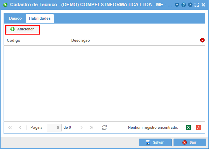 Na aba Habilidades, clique no botão adicionar para inserir uma ou mais habilidades para o técnico (elas não são obrigatórias). As habilidades podem ser previamente cadastradas na funcionalidade de cadastro de habilidades ou podem ser criadas no momento do cadastro do técnico.