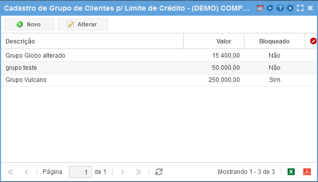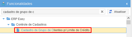Acesse a tela de "Cadastro de Grupos de Clientes para Limite de Crédito", conforme mostrado abaixo.