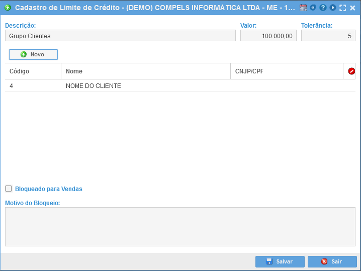 Valor: Informar o valor de crédito aprovado para este grupo, caso informado será validado no ato da confirmação do pedido de venda.