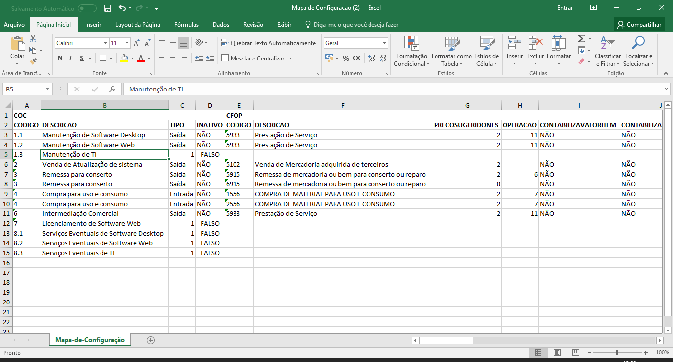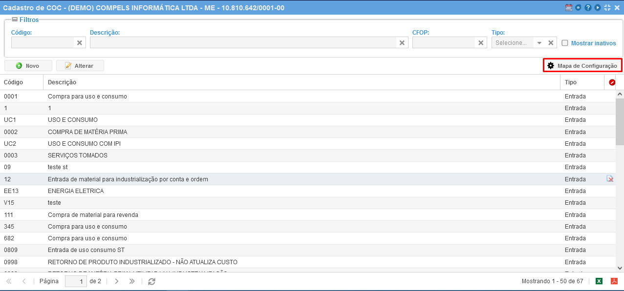 Caso seja necessário conferir a tabela de COCs de forma mais rápida, ou para enviá-la para validação da contabilidade externa, gere o relatório de mapa de configuração, conforme imagem abaixo.