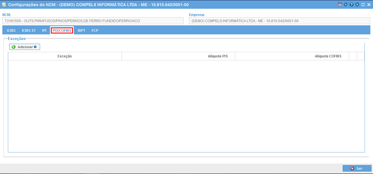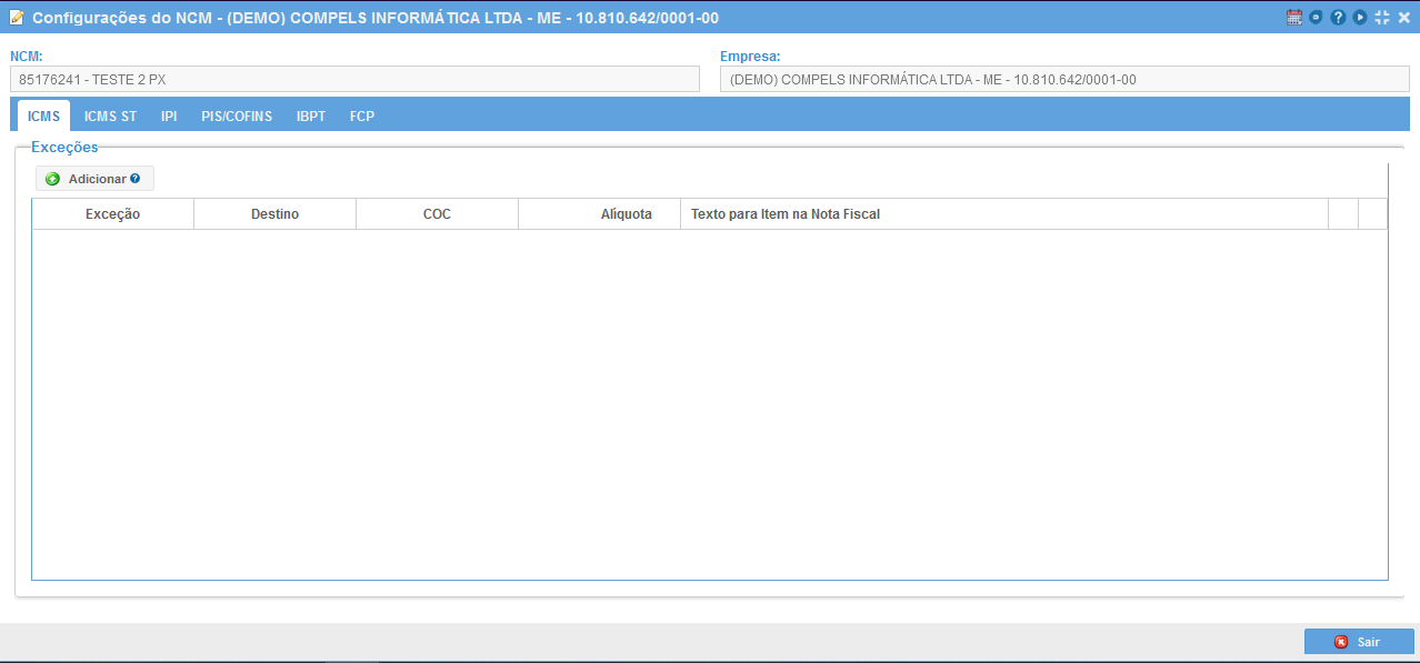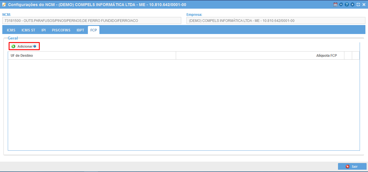 Assim como as abas de ICMS, ICMS ST e IPI possuem exceções, a aba de FCP também possui exceção por NCM. No caso, a porcentagem de FCP por estado é definido na tabela de Alíquotas Internas e Interestaduais, assim como é o cálculo de ICMS, porém, conforme já relatado, há como colocar exceções da alíquota de FCP por estado na aba NCM. Seguem abaixo as imagens para adicionar exceções de FCP por estado.