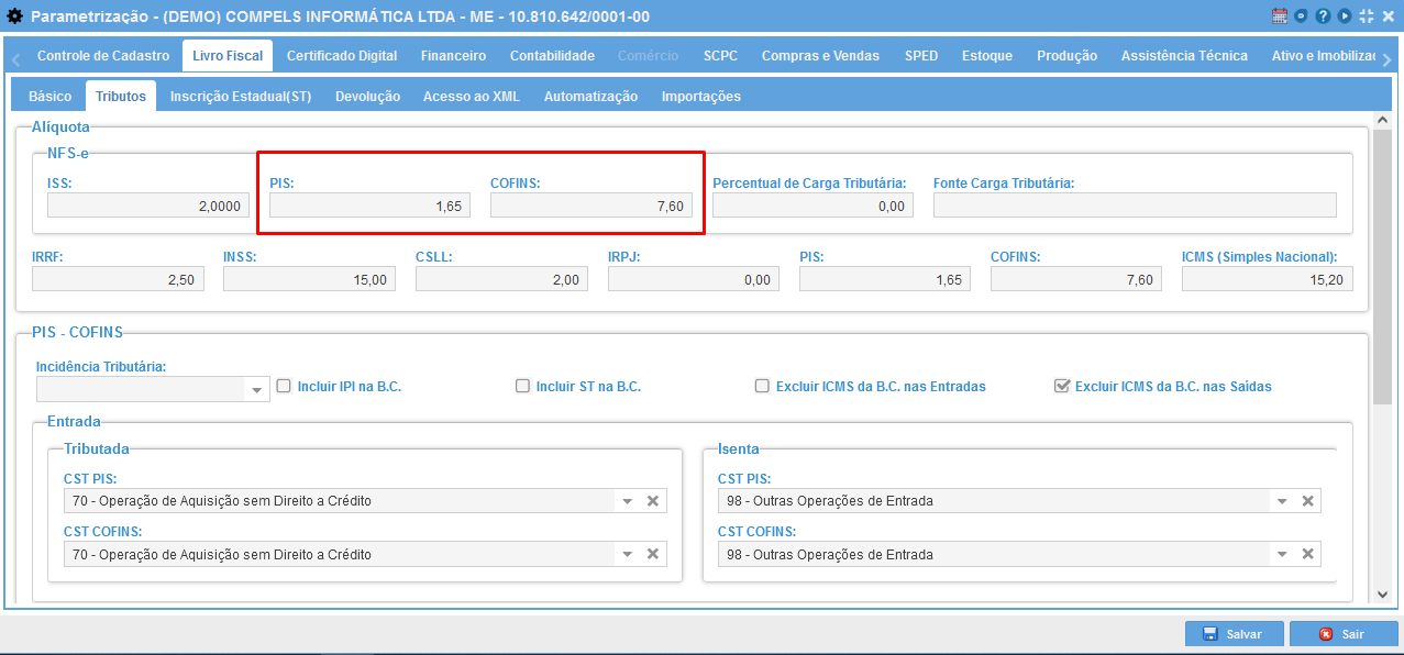 O primeiro passo para configuração destes impostos é definido na Parametrização, através do preenchimento dos campos CST, incidência tributária e também das alíquotas conforme imagem abaixo. O acesso a Parametrização é feito por um usuário do tipo "Administrador".