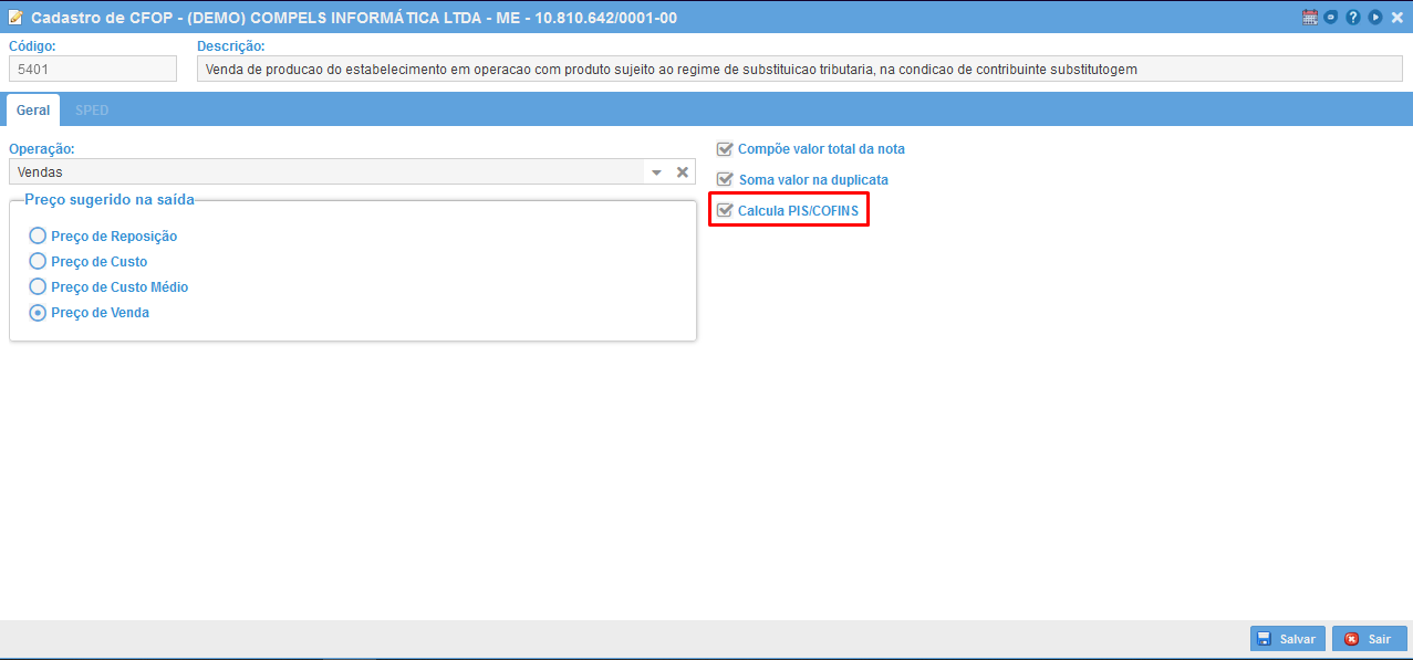 Após isso, todos os CFOPs que são considerados "tributados", devem ter a opção "Calcula PIS/COFINS" marcada conforme abaixo (tanto entrada quanto saída).