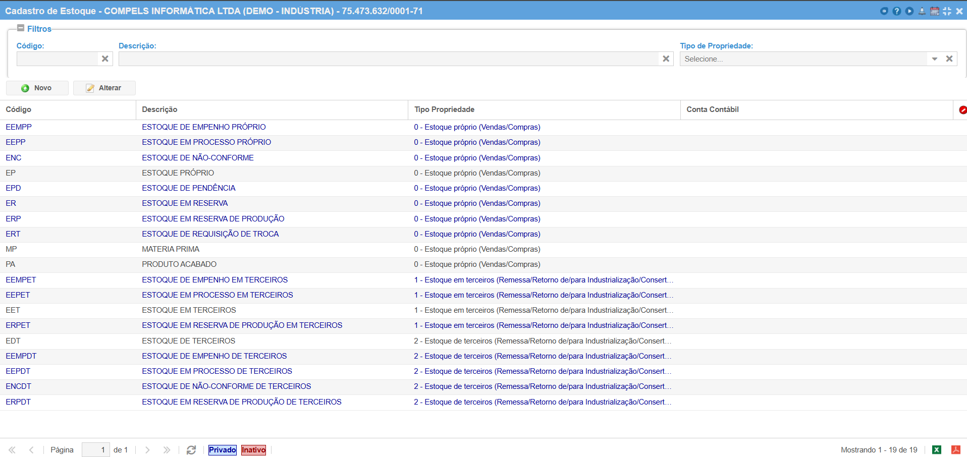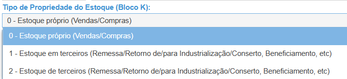 - Tipo de Propriedade do Estoque (Bloco K): informar de quem é a posse dos itens que estão dentro deste estoque.