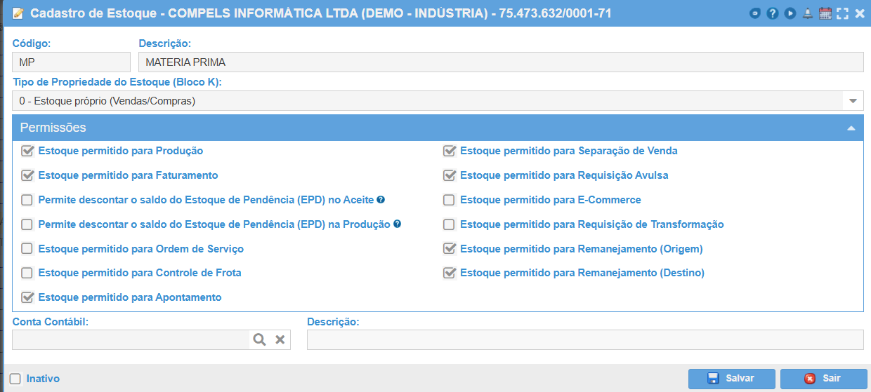 - Inativo: inativar a utilização do estoque.