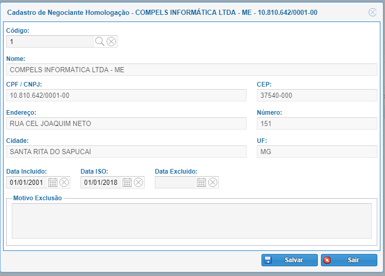 Motivo Exclusão: motivo de encerramento das atividades de fornecimento com a empresa.