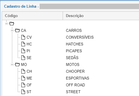 Vamos imaginar o setor automobilístico, que deseja dividir seus produtos em linhas, mais especificamente de uma empresa que venda carros e motos. Então para seus produtos, temos dois grandes grupos CARROS e MOTOS, conforme imagem abaixo: