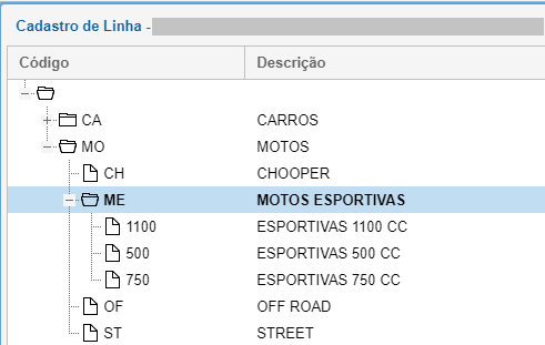 Vamos a um exemplo, se colocarmos subdivisão de cilindradas na linha de motos esportivas teremos a seguinte configuração: