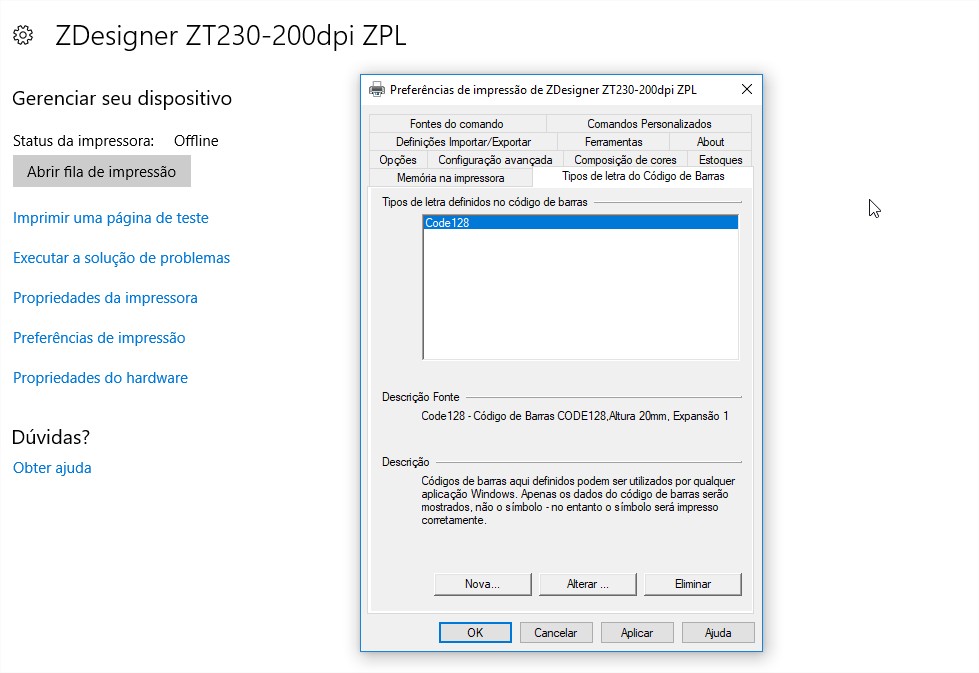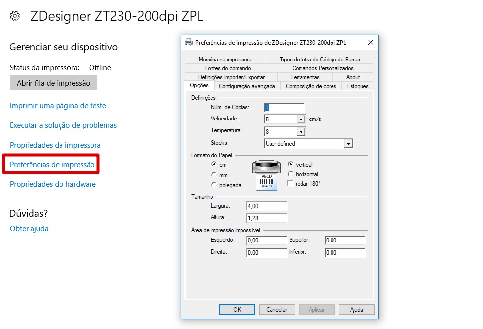 A configuração da impressora pode ser realizada tanto pela preferência de impressão do Windows (no menu Impressoras) quanto pelo software Zebra Setup Utilities acoplado ao CD de Instalação da impressora.