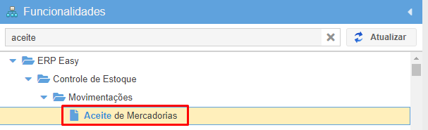 Através da funcionalidade “Aceite de Mercadorias” quantidades de itens podem ser adicionadas ao estoque da empresa.