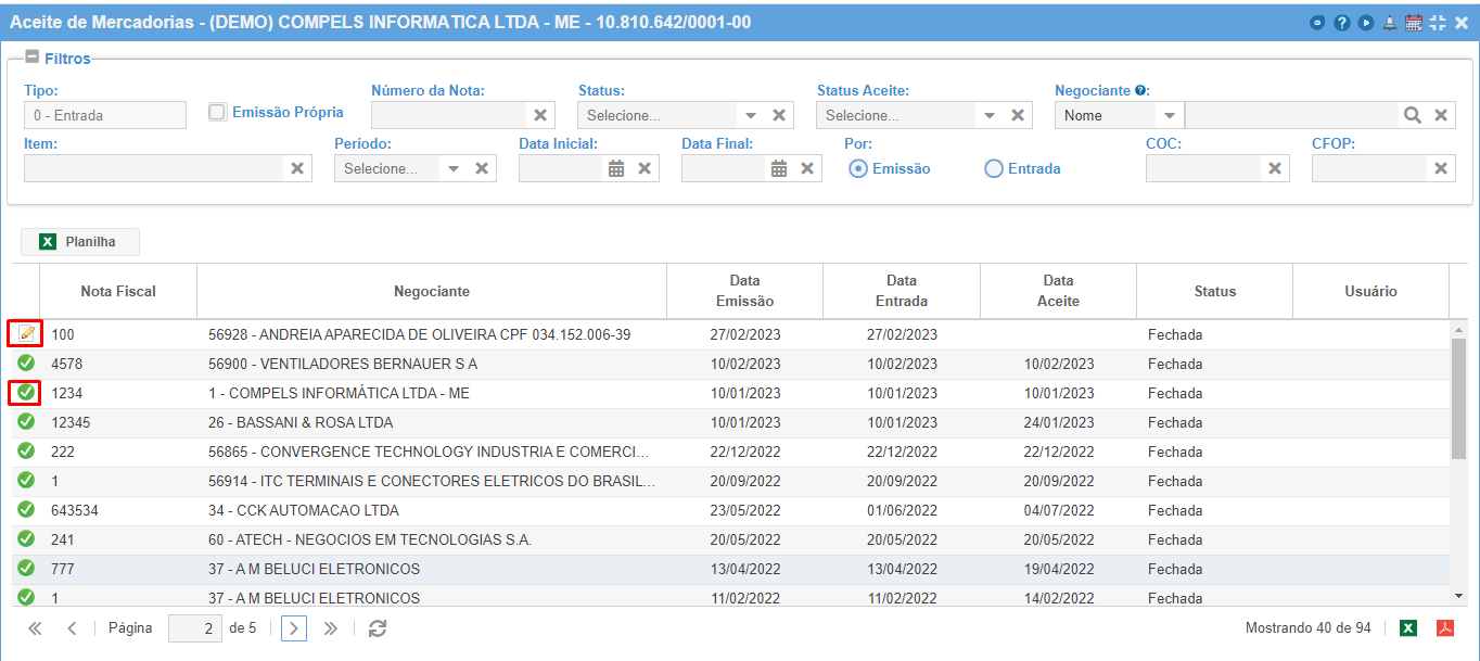 Na listagem acima, são mostradas todas as notas que foram lançadas no sistema. As notas com o ícone indicam que o aceite já foi efetuado, ou seja que as mercadorias já foram computadas no estoque, já as notas com o ícone