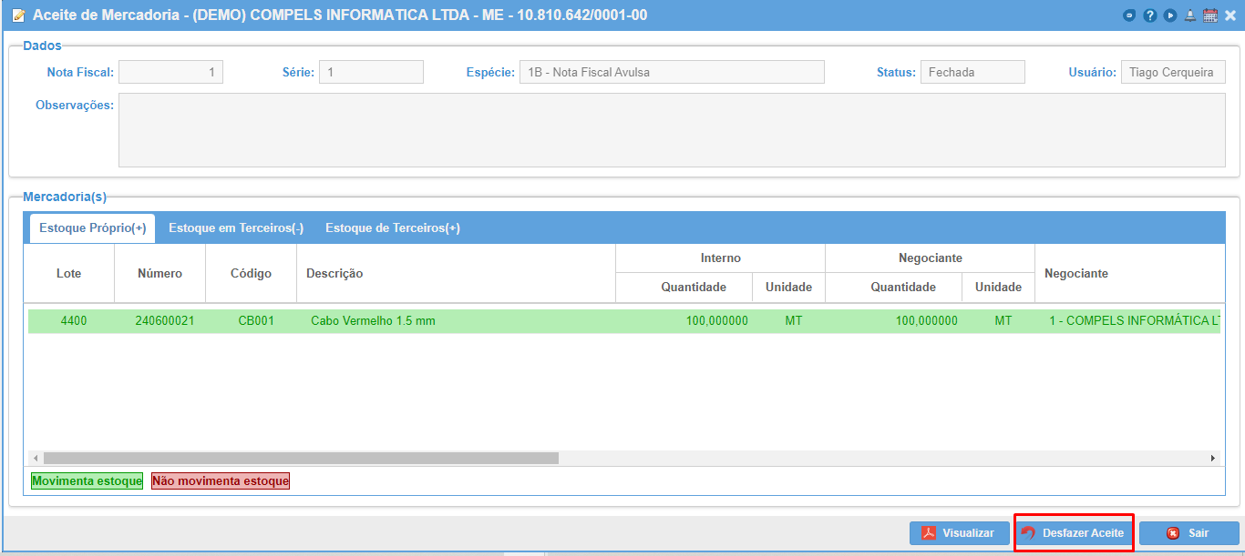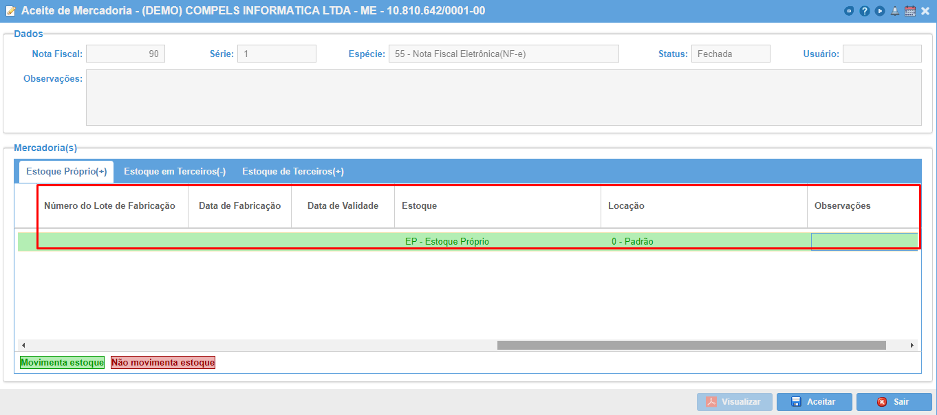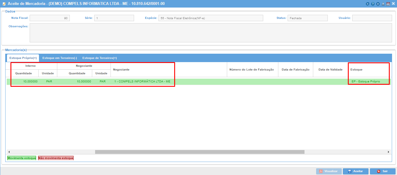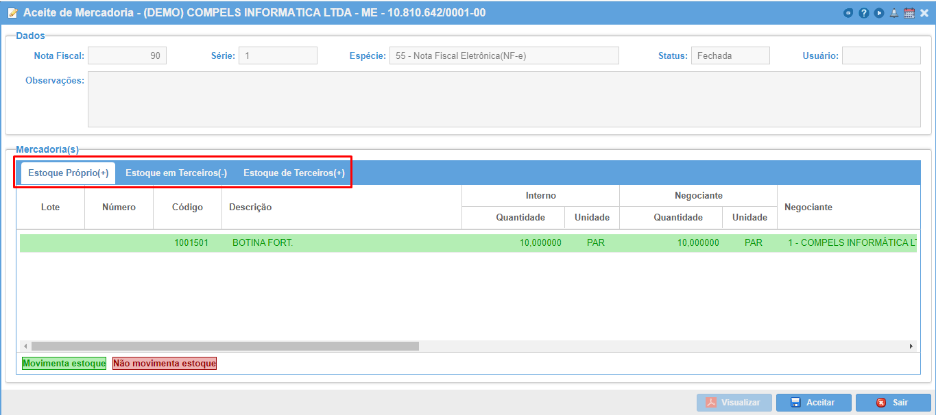 Ao acessar uma nota fiscal, são mostrados os itens que serão aceitos para o estoque, já separados por tipo de posse.