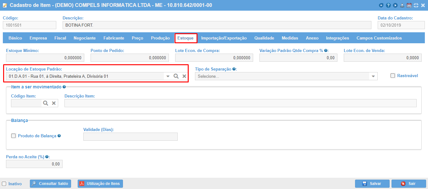 Data de Validade: (campo opcional) informar data de validade do item caso exista. Este campo é informativo e utilizado para controle de validade para itens que possuam tal característica.