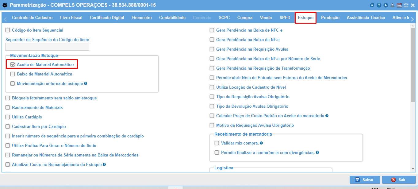 Para ativar o aceite automático acesse as parametrizações da empresa na aba "Estoque" e selecione a opção "Aceite de Material Automático".