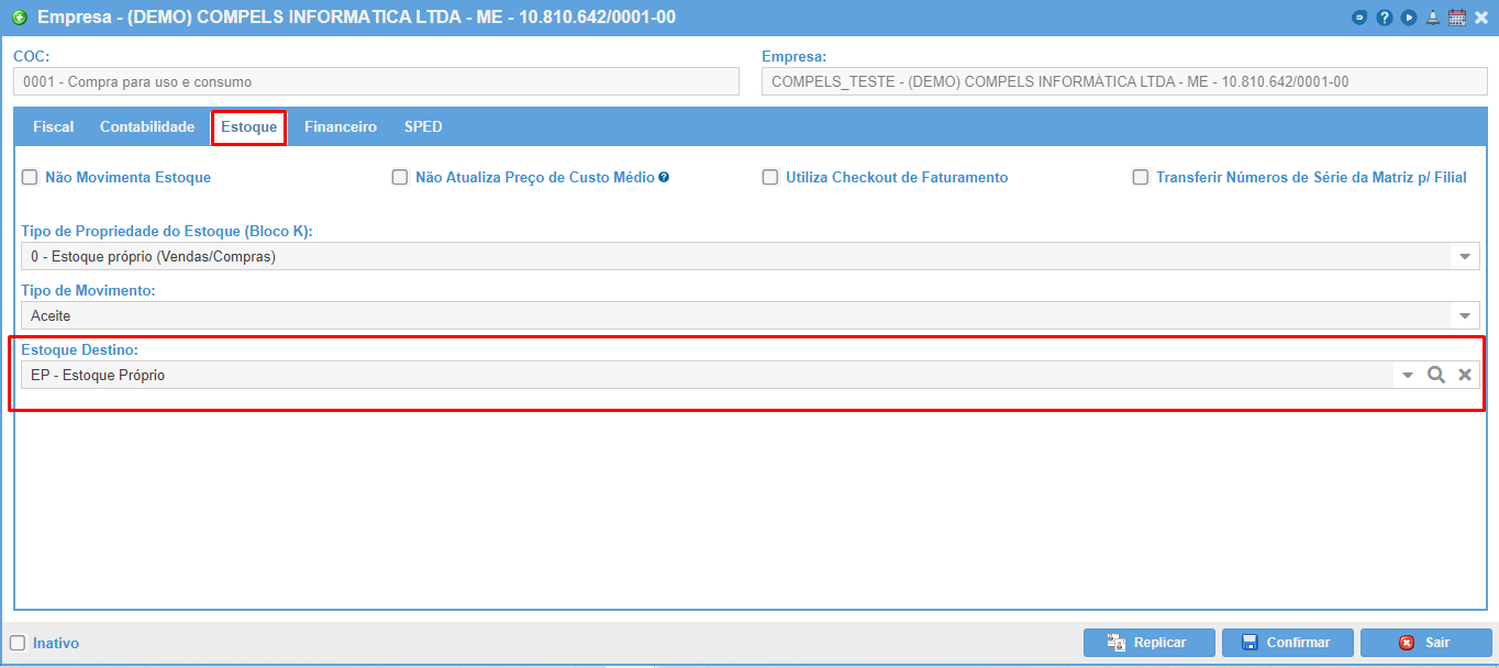 Caso não tenha nenhum estoque destino definido no cadastro do COC o aceite será realizado no primeiro estoque cadastrado no "Cadastro de Estoque".