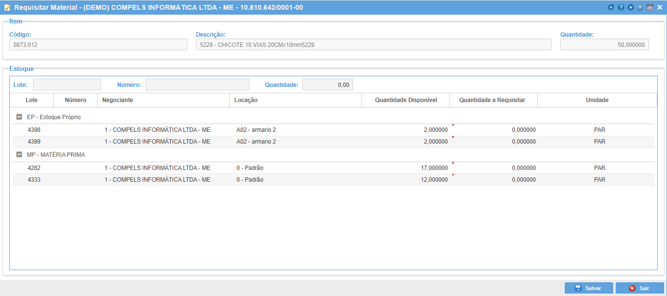 O saldo dos itens será consumido dos lotes mais antigos (PEPS/FIFO), caso seja necessário escolher o lote, clique no ícone para informar os lotes que terão o saldo consumido.