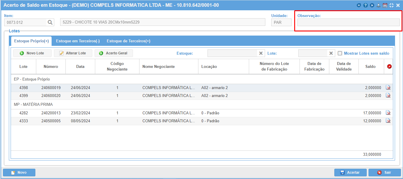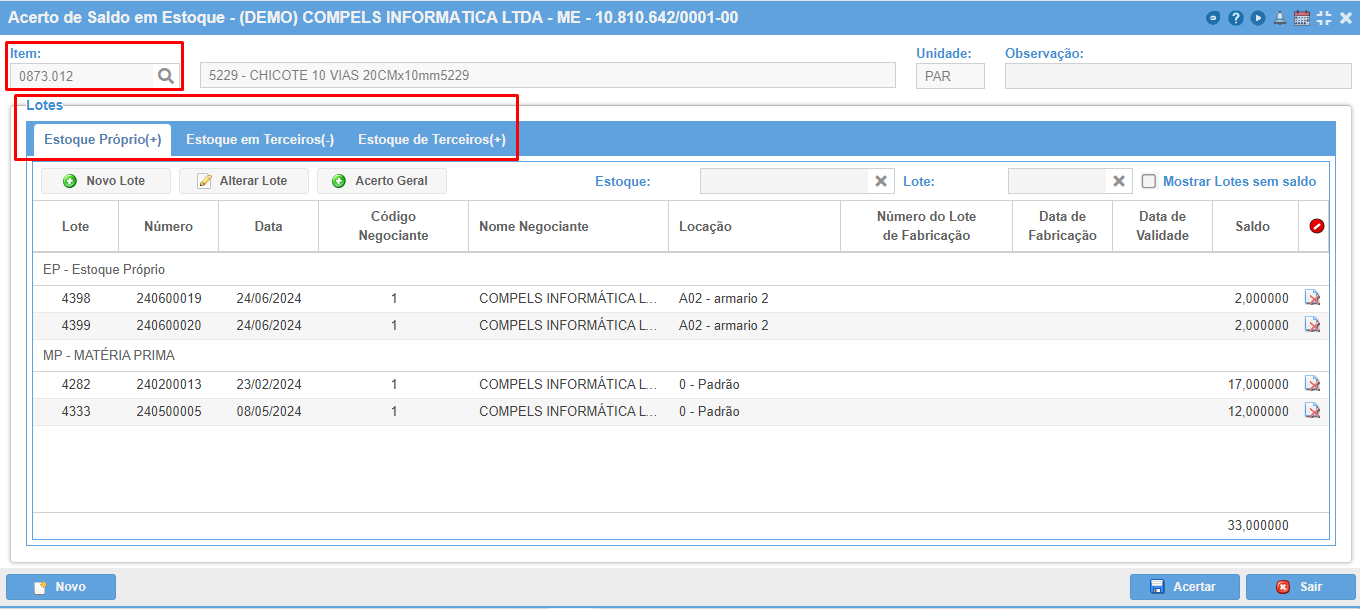 Quando entramos nesta tela, devemos informar qual o item será acertado, em seguida serão mostrados todos os lotes existentes nos estoques (se houver) já separados pela posse (Próprio, Em Terceiros ou De Terceiros), conforme divisão nas 3 abas.