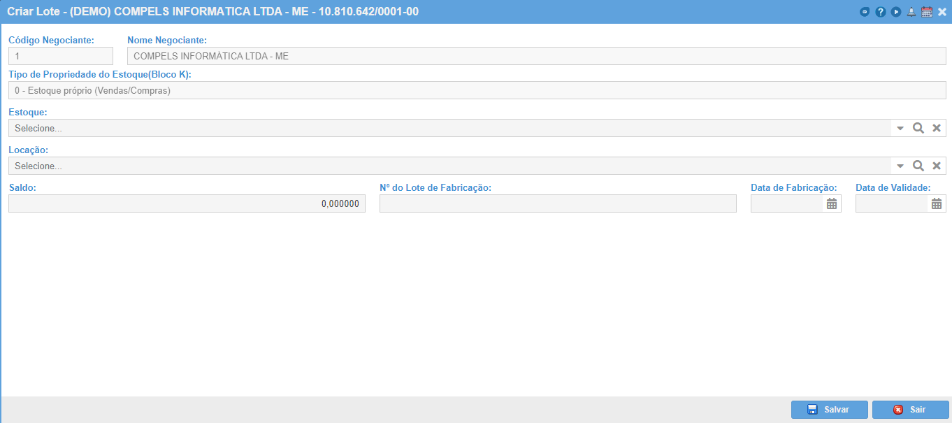2 - Criação de um novo lote, para representar produtos que estão no inventário físico mas não constam no sistema, para isso clique na opção e faça o lançamento das informações conforme a necessidade.