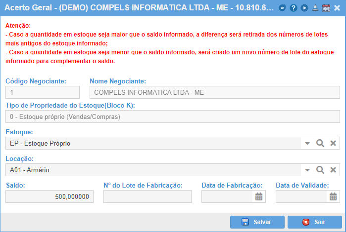 - Caso o valor informado seja maior que o existente, novos lotes serão criados.